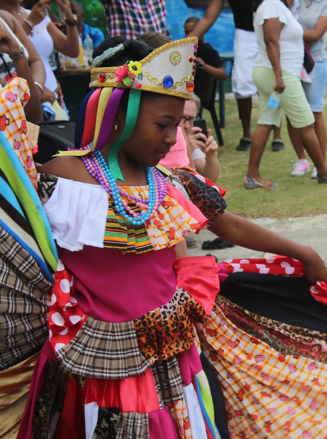 The dresses of the Congo people are full of color. The women wear a two-piece skirt, a shirt with “arandina” and a skirt made of scraps of fabrics. They adorn their head with colorful flowers. The men wear their clothing backwards, a coconut bast hat adorned with feathers, shells, mirrors or beads, and paint their faces with charcoal. The Congo dance is performed with bare feet, as a symbol of the black’s relationship with the earth.